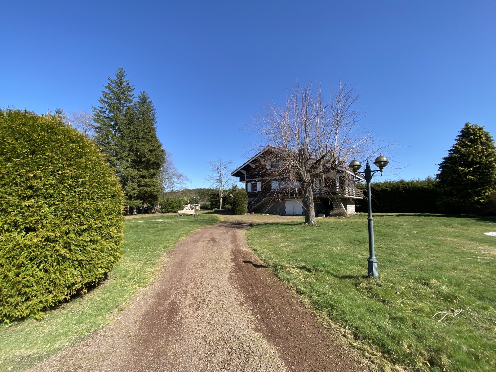 L'étage supérieur offre quant à lui 2 chambres, un bureau mansardé de 6 m2 (10 m2 au sol) crée dans les combles attenantes, une salle de bain de 6,50 m2 avec fenêtre, baignoire, vasque et un 2ème wc, 2 greniers de 11 m2 chacun complètent ce bien offrant ainsi stockage ou dressings supplémentaires bien pratiques pour les deux chambres. La construction date de 1968. La grande parcelle de 2200 m2 arborée, plate et bien exposée entourant la propriété donne un sentiment de liberté et d'aisance. Ici on se croirait en vacances à l'année ! Une dépendance de 45 m2 sur le terrain, offre 2 garages supplémentaires. Le secteur est desservi par le réseau des transports en commun à proximité, avec une école primaire sur place. Les commerces et commodités (complexe sportif, collège, école de musique, pôle santé, cinéma, médiathèque...) de St Genest Malifaux sont accessibles en seulement 6 mn en voiture depuis la maison ! Laissez-vous charmer par ce bien proposé au prix de 312 500 € honoraires à charge vendeurs. Pour ce qui est de l'impôt foncier, il s'élève à 1 200 euros sur douze mois. Ce joli Chalet plein de charme au milieu de la verdure, a été rénové en 2021-2022 pour le gros oeuvre : toiture avec tuiles neuves, isolation des murs et de la toiture (sarking), électricité entièrement refaite à neuf, double vitrage et volets électriques centralisés posés en 2021, cuisine neuve actuelle et de bon goût, électro ménager neuf sous garantie... Chaudière au fuel (1997) entretenue. Possibilité d'installer une cheminée ou un poêle si souhaité (conduit existant en place). DPE D, grâce à une bonne et récente isolation.. Seules les 2 chambres avec la salle de bain de l'étage supérieur nécessitent un bon rafrachissement et seront éventuellement à remettre à votre goût. L'ensemble est majoritairement en très bon état. Ce bien est construit hors lotissement et ne souffre d'aucun vis à vis !