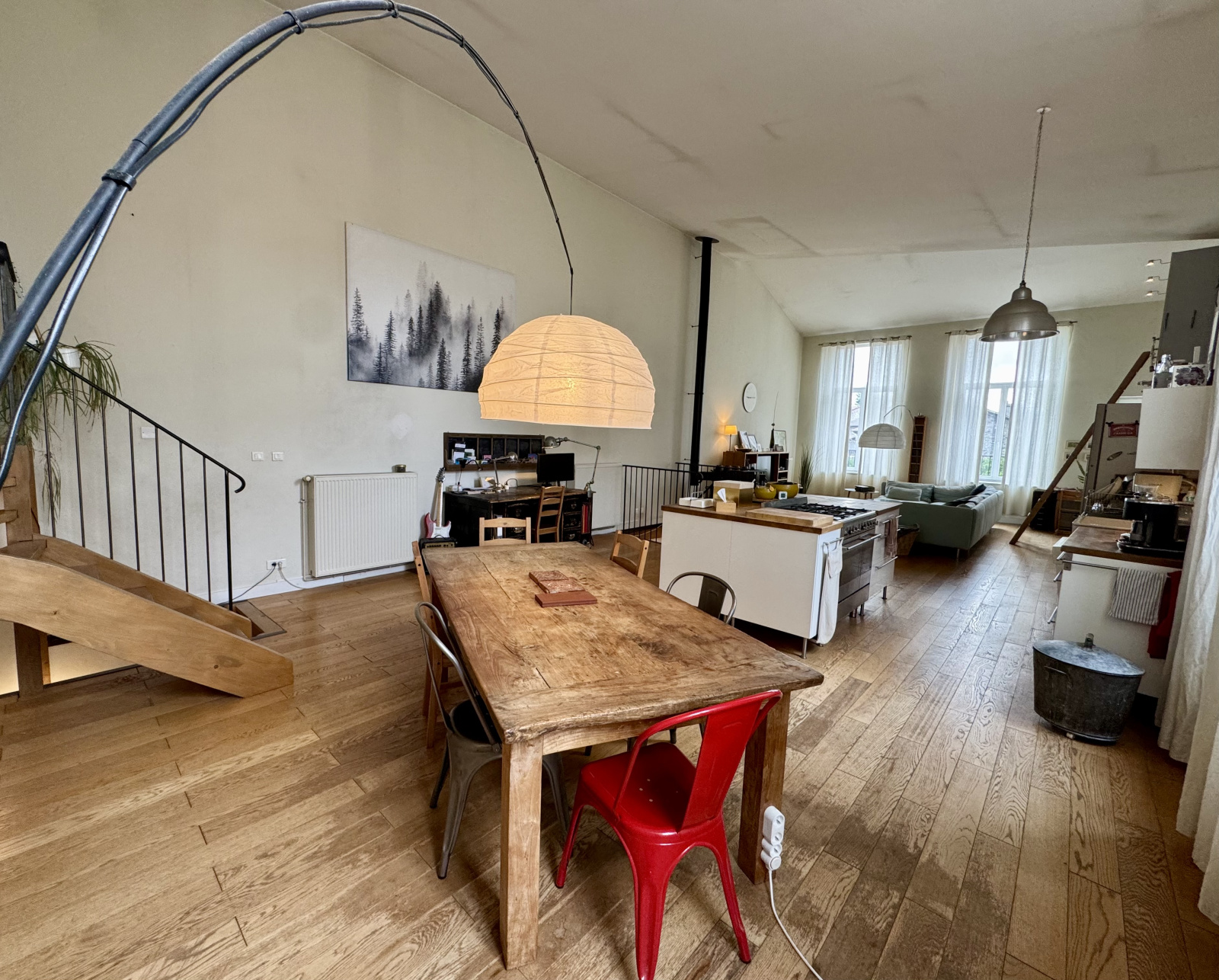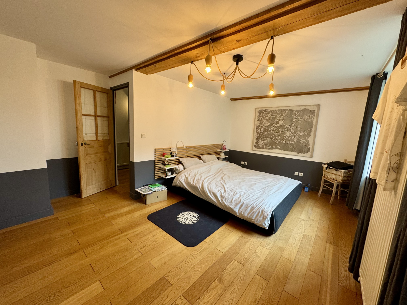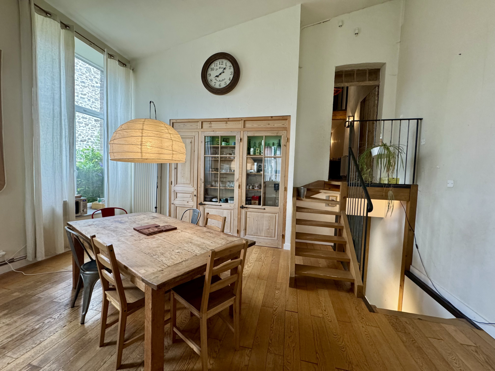 Vous accèderez au 1er étage par un bel escalier en bois arrivant sur une grande et belle pie?ce de vie de 75 m2 environ, 3 grandes fenêtres apportent beaucoup de lumière à cette superbe pièce aux beaux volumes (hauteur sous plafond de 4,50 m), beau parquet, côté salon avec une belle bibliothèque, un poêle à bois (de 2009) apporte une douceur et une chaleur confortable en hiver, une cuisine équipée avec ilot central, un espace salle à manger, depuis la pièce de vie un escalier bois dessert le 2eme étage où vous trouverez 2 chambres, dont une suite parentale avec chambre de 17,50 m2 avec salle d'eau de 7,70 m2 (double vasques, douche italienne et fenêtre) avec un dressing aménagé de 5,50 m2 attenant à la salle d'eau, puis une chambre de 14 m2, un couloir avec placards, un wc avec lave-mains