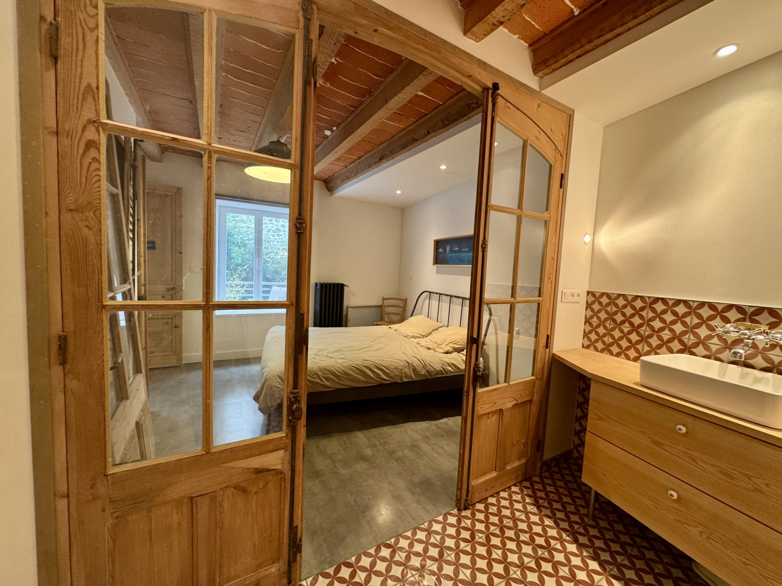 Cette maiosn est composée d'un grand hall et sas avec le cachet d'une belle verrière acier, ouvre sur une grande pièce avec placards dotées de magnifiques portes anciennes, wc avec lave-mains, en enfilade vous trouverez un cellier, un atelier de bricolage avec accès sur le jardinet pratique aussi pour ranger les velos , une grande pie?ce de 35 m2 a usage actuellement de salon télé /salle de jeux ou sport ouverte également sur le jardin et la terrasse en bois, bien exposée plein sud, également en rdc une chambre d'amis de 13 m2 avec sa salle d’eau privative (neuve) de 4,50 m2 avec douche italienne et vasque, une buanderie aménagée de grands placards, un wc, et un accès à la cave en sous sol logeant la chaudière.