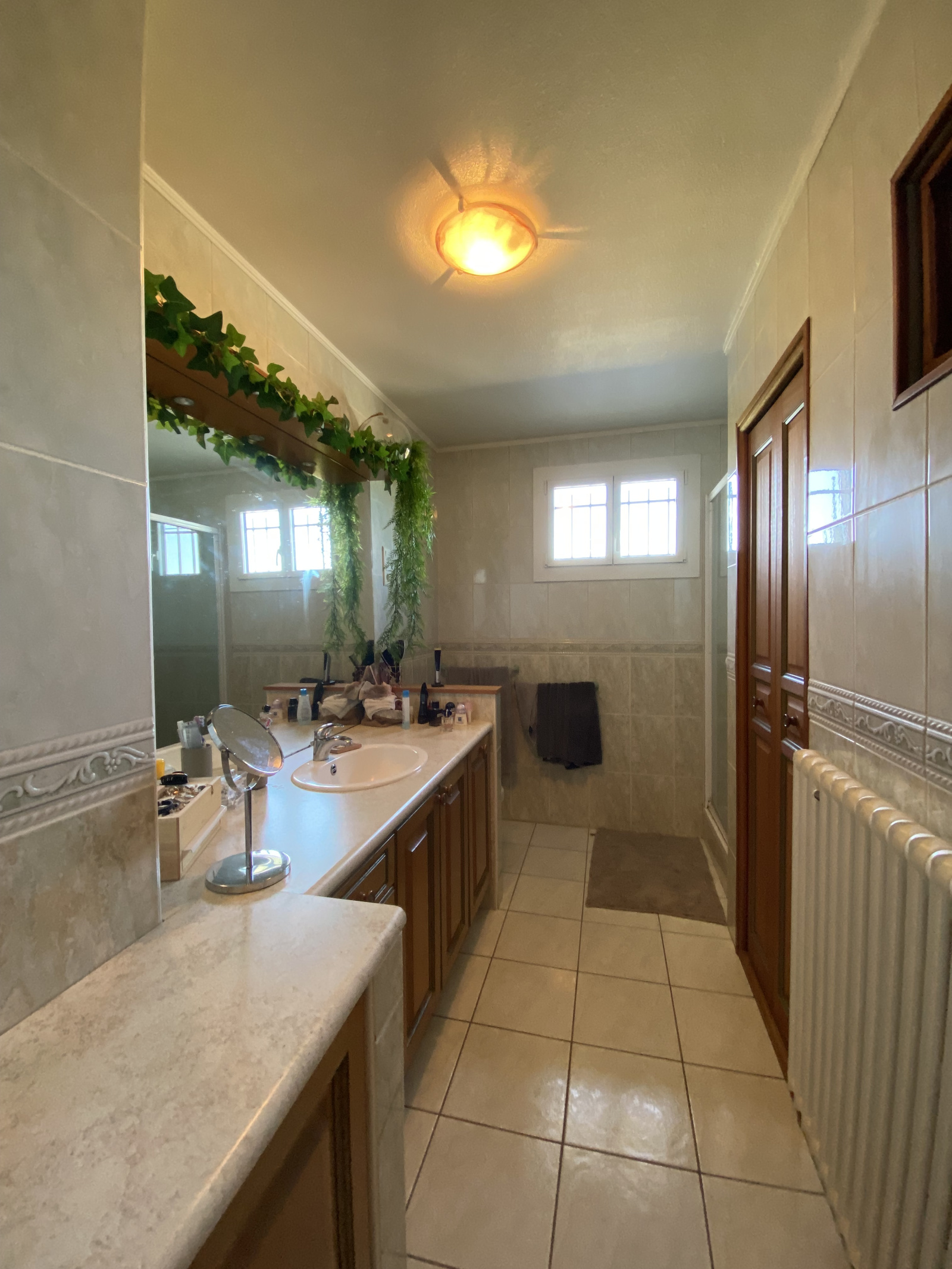 L'étage supérieur avec sa surface plancher intérieure habitable de 110m² offre un espace de vie fonctionnel, clair et agréable à vivre. L'entrée dessert une cuisine équipée récente, un espace de vie avec un salon de 12 m2 ouvert sur une jolie terrasse de 15 m2 exposée au sud sur le jardin, une salle à manger de 25 m2 avec un balcon exposé ouest, un couloir dessert 3 chambres de 13 m2, 12 m2 et 10m2, une grande salle de bain avec double vasques, douche, rangements et fenêtre, et un wc séparé. Des placards. Cette habitation vous fait bénéficier de 3 garages privatifs au total, 2en sous sol et un 3ème garage attenant à la maison avec portail automatisé. Concernant le mode de chauffage, ne chaudière à granulés très récente de 2020 avec un Silo de 4T. Des huisseries en double vitrage alu performant de 2019 avec volets électriques. DPE E nouvelle version, avec une dépense annuelle calculée entre 1090 € et 1530 €, prix moyens des énergies indexés au 1er/1/21 selon diagnostic faits le 10/10/23. Ce bien est également équipé d'un portail d'entrée automatisé, d'un interphone, d'une alarme, d'une porte sécurisée, double vitrage alu avec isolation phonique.