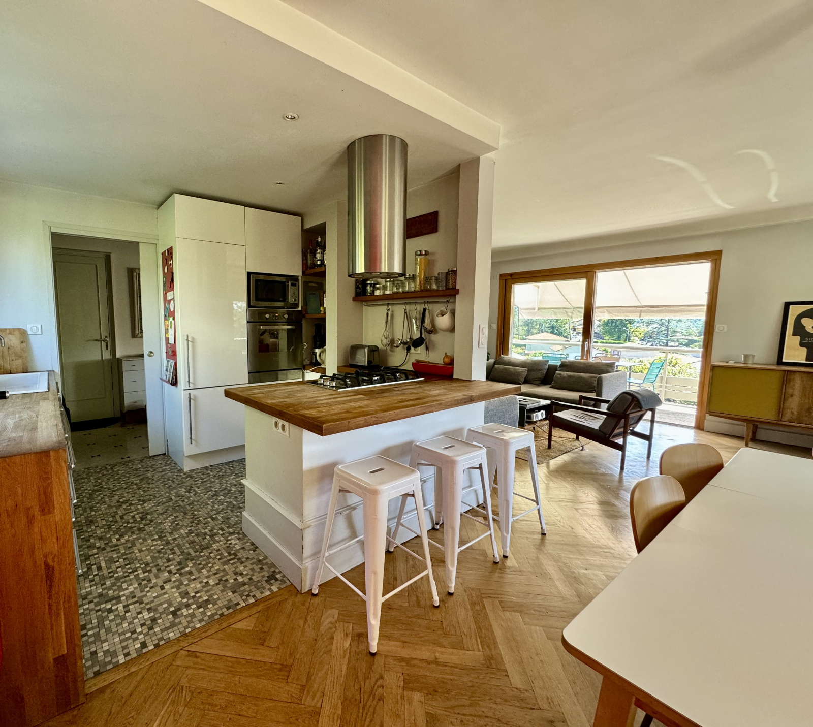 L'espace intérieur est composé d' un hall d'entrée de 7 m2, desservant une belle pièce de vie avec cuisine équipée, pour une surface de 45 m2, l'insert bois donne un côté cosy et chaleureux à la partie salon ouverte sur un grand balcon-terrasse de 25 m2 exposé côté sud-ouest, idéal pour prendre vos repas, à l'ombre d'une banne.