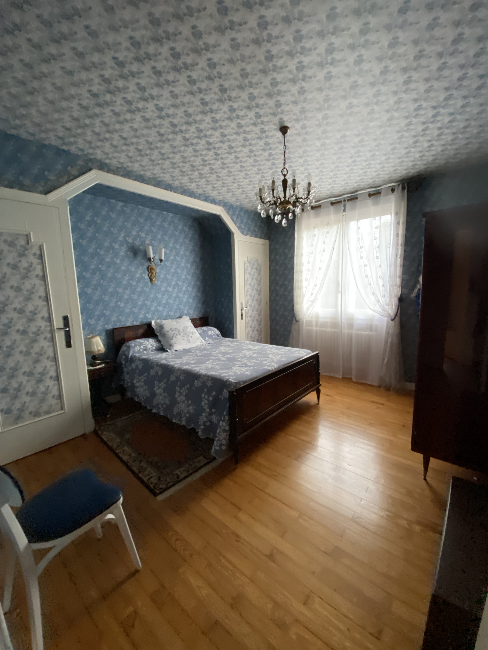 L'étage supérieur déservi par des escaliers extérieurs et intérieur avec accès au garage, offre une surface habitable de 90 m2 comprenant une entrée de 7,40 m2, distribuant une cuisine non équipée de 13,20 m2 avec possibilité d'ouverture sur la pièce de vie de 29 m2 composée d'une salle à manger et d'un salon, avec cheminée d'ornement non fonctionnelle, cette pièce de vie s'ouvre sur une véranda de 10 m2, 2 chambres spacieuses à cet étage, chacune avec parquet au sol, une chambre de 14,50 m2 et une chambre de 13,60 m2, une salle de bain avec baignoire et lavabo d'origine, de 5,80 m2 à relooker, éclairée d'une fenêtre, un wc séparé. Placards.