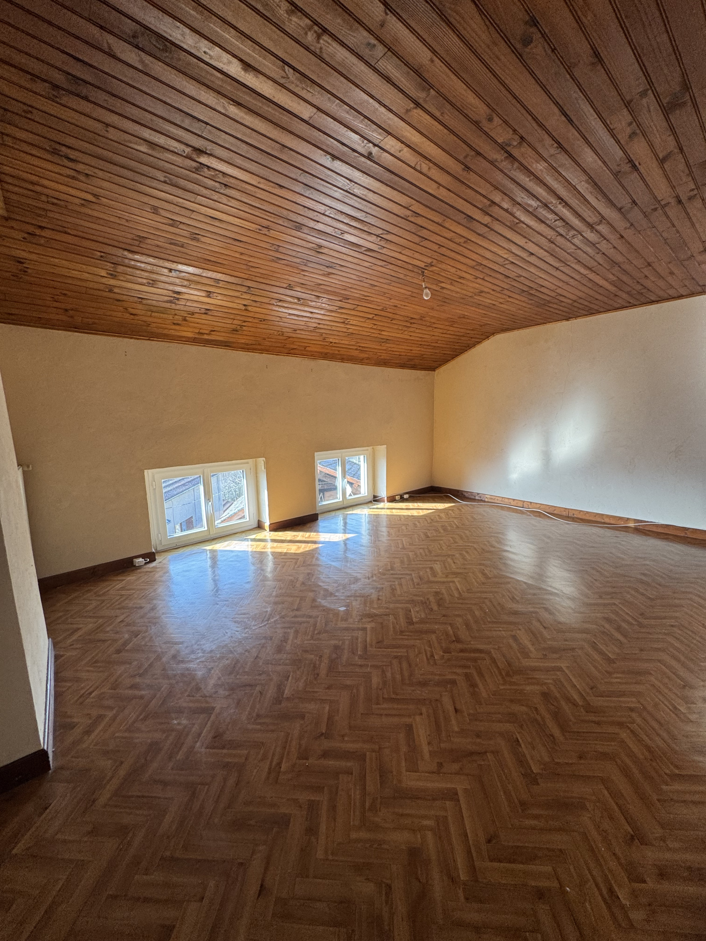 Les combles au-dessus, offrent une pièce de 17,22 m2 parquet au sol, et fenêtre, avec de chaque côté des placards mansardés de 7,73 m2 et 11 m2 à usage de placards stockage