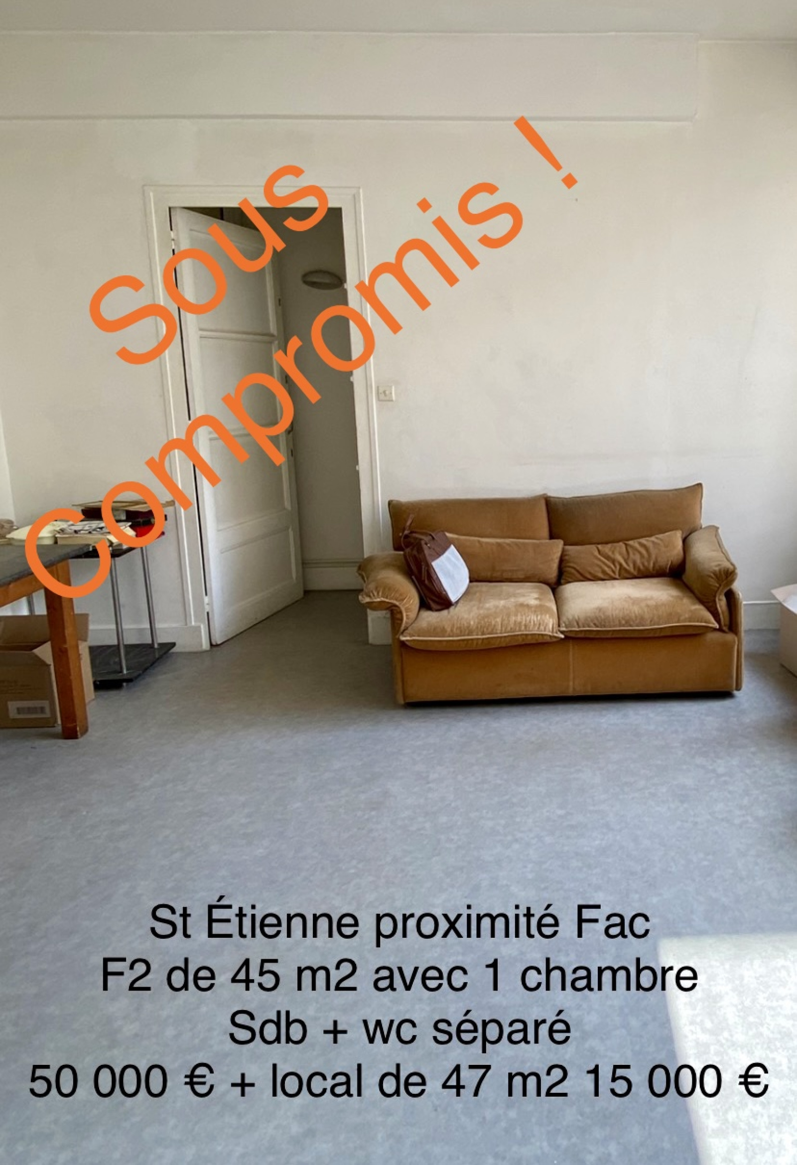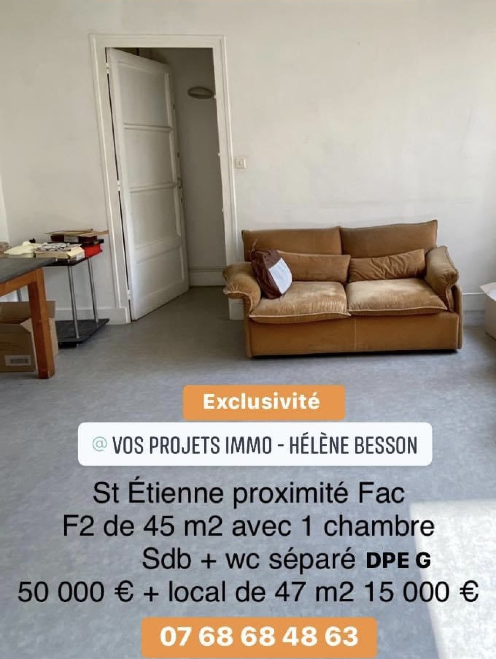 EN EXCLUSIVITÉ CHEZ "VOS PROJETS IMMO-HELENE BESSON" Idéal investissement pour metre en locatf ou pour primo accédant en habitation principale, Visitez sans tarder cet appartement bien placé à proximité des Facs J Monnet à St Etienne, Rue Denis Papin. Ce F2 de 45 m2 (44,73 loi carrez) est situé au 1er étage sans ascenseur d'un immeuble ancien avec cachet.