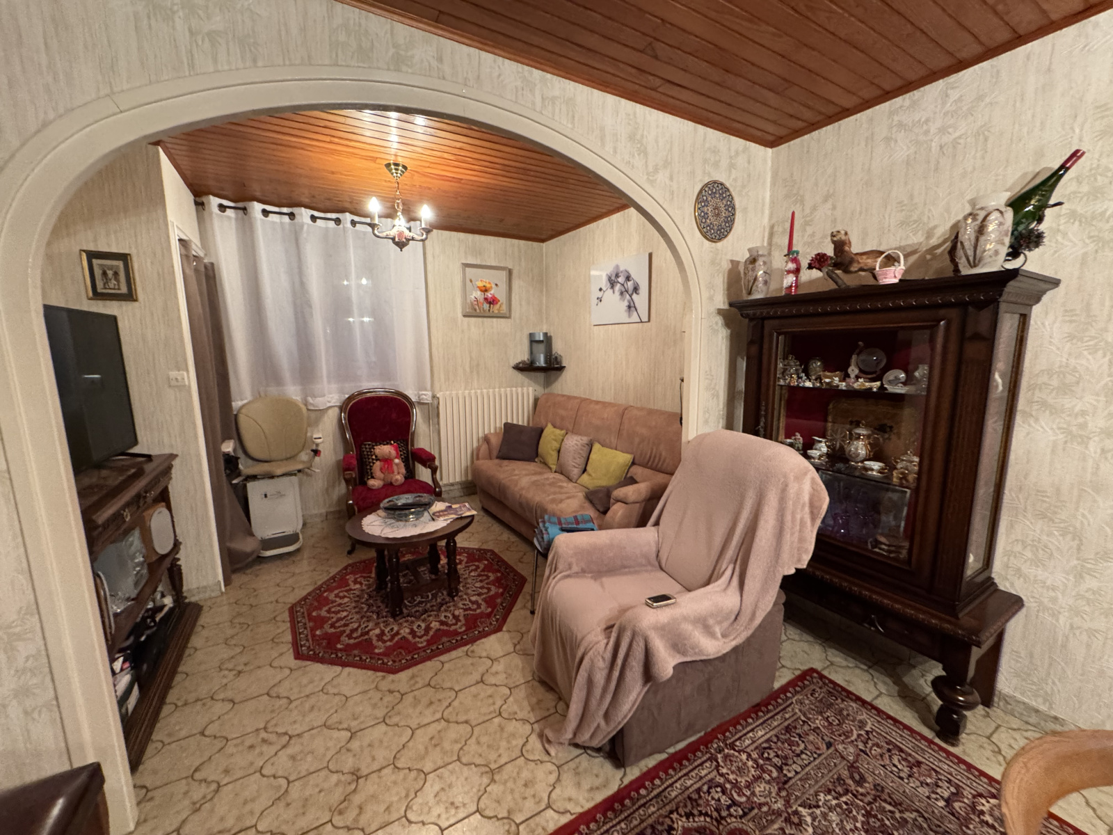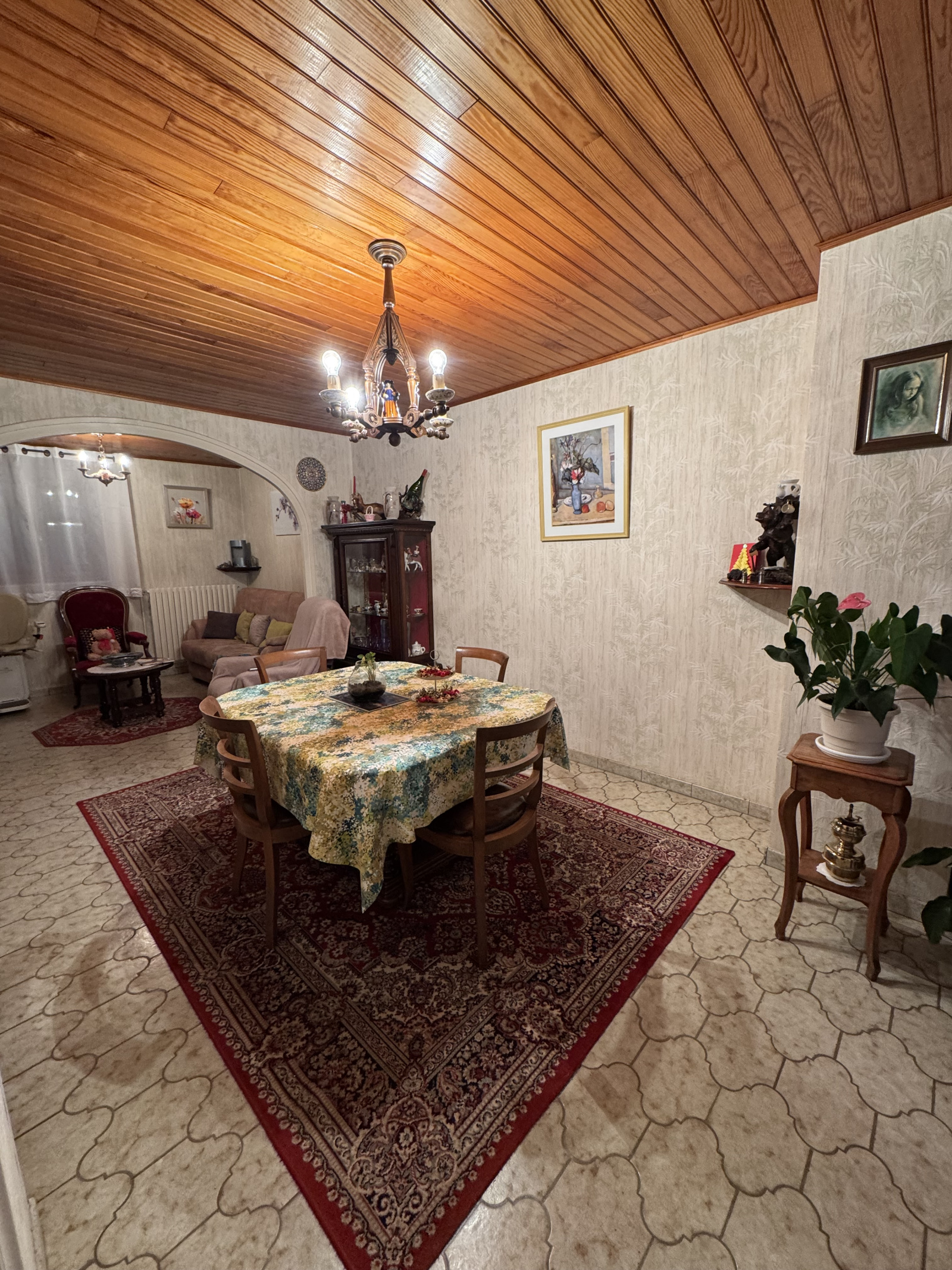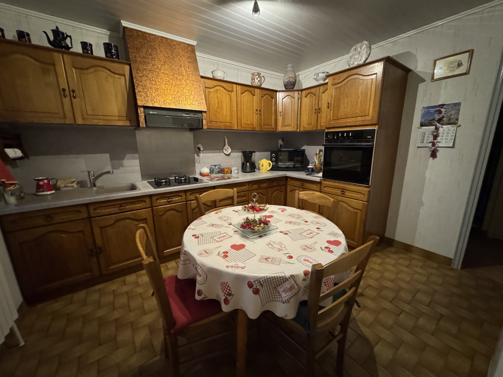 Au RDC une entrée dessert une cuisine équipée de 11,55 m2, un salon séjour de 23 m2, une buanderie de 9 m2, un wc avec lave mains. À l'étage se trouvent 3 chambres de 12 m2 chacune, plancher au sol, une salle d'eau de 5 m2 avec douche, vasque et fenêtre, un 2eme wc avec lave mains. Dégagements et placards. Cave en sous sol avec chaufferie et cellier. Grenier. DPE E (357) GES C (28) Chauffage au bois et chauffage au fuel Chaudière Baudérus de 2001. Cumulus de 200 L d'avril 2024. Double vitrage PVC. Dalle Beton en RDC. Plancher à l'étage dans les chambres. Assainissement relié au tout à l'égout.